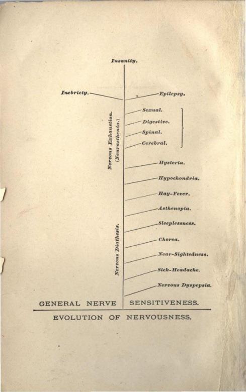 Finalmente um gráfico que atenda as nossas expectativas e forneça uma medida científica da ansiedade e do nervoso, ainda que seja datado de 1881. Notem, amigos, que o importante é manter o nervosismo entre a dispepsia e a dor de cabeça, níveis perfeitamente medicáveis.